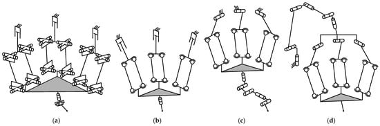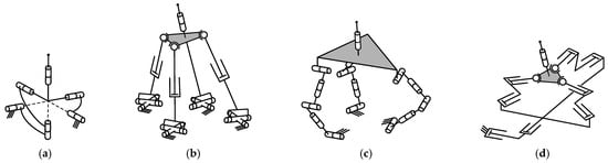 This section looks at the applications of parallel–serial manipulators presented in Figure 4 and examines the architectures of these mechanical systems. In addition, the section mentions the problems solved by scholars when they designed and analyzed these manipulators. The methods scholars have used to handle these problems are discussed in Section 4. The kinematic schemes of manipulators presented in this section aim to illustrate the relative arrangement of the joints rather than the structural design. The latter can be found in the corresponding articles cited in the text.