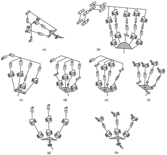 Parallel–serial machining manipulators based on other parallel mechanisms: (a) R(1-RR/2-UPS)RRR (RNT) [274]; (b) PaPa(1-UCR/4-UCU) (CraftsRobot) [277]; (c) PP(1-PRU/3-PUS) [281]; (d) P(2-PRU/2-PUS) [282]; (e) P(2-RPU/2-UPS) [283]; (f) (2-UPR/2-UPS)R [284]; (g) (3-PUU)RR [285]; (h) (3-UPU)RRR [286].