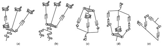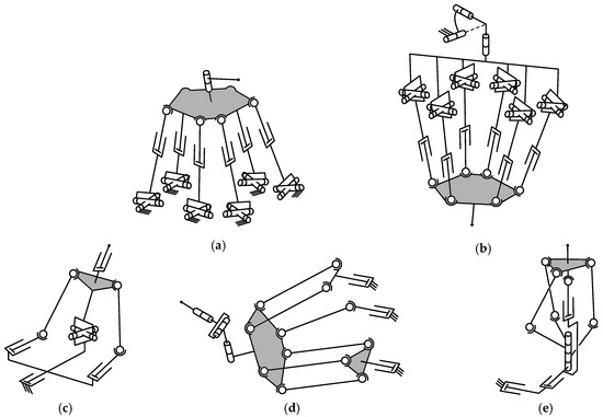 Architectures of robotic manipulators referred to as “parallel–serial” or “hybrid”: (a) parallel–parallel [17]; (b) parallel–serial (connected) [18]; (c) parallel–serial (independent) [21]; (d) quasi-serial [22]; (e) interconnected [23].