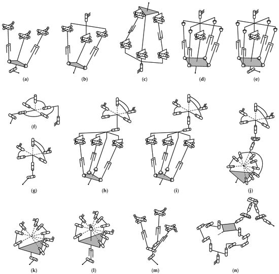 Parallel–serial machining manipulators of the Tricept family: (a) (1-UP/3-UPS)RRR (Tetrabot) [33]; (b) (1-UP/3-UPS)RR (Tricept) [43]; (c) (1-UP/3-SPU)RR [56]; (d) (1-UP/3-PUS)RR (Georg V) [57]; (e) (1-RP/2-RPS)RR (Bicept) [58]; (f) (1-UP/2-UPS)RR (TriVariant) [59]; (g) (1-U/2-UPS)PRR (TriVariant B) [60]; (h) (1-UP/3-UPS)PRR (Tricept IV) [61]; (i) (R(1-RP/2-RPS)/1-UPS)RR (TriMule) [62]; (j) (R(1-RP/1-RPS)/2-UPS)RR (Trifree) [63]; (k) (R(2-RPR)U/1-UP)RR [64]; (l) (R(1-RP/1-RPR)/1-UPS)RR [65]; (m) (R(4-RPR)/(2-RPR)R)RR [66]; (n) PP(1-UP/3-UPS) [67]; (o) PP(1-PU/2-UPS) [68]; (p) (1-PU/2-PSS)PP [69].