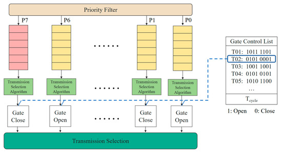 In order to achieve bounded delay and reduce jitter during transmission, the TSN task group has proposed various traffic-shaping and -scheduling mechanisms in recent years. The time-aware shaper (TAS) mechanism proposed in the IEEE 802.1Qbv protocol [8] enables deterministic transmission of time-sensitive streams that are feasible by virtue of strict prioritization mechanisms and time-slot reservation [9]. As shown in Figure 1, traffic will be filtered into different queues according to its priority when it passes through the egress port of the switch. The gate status of each queue is controlled by the gate control list (GCL) periodically. This fine-grained time-slot control ensures that time-triggered (TT) flows that are typically used to transfer mission-critical data, such as control signals, are not disturbed by the best-effort (BE) flows. Therefore, finding a feasible GCL is crucial for achieving deterministic transmission of TT streams, even when there are BE streams transmitting simultaneously on the network at the same time.