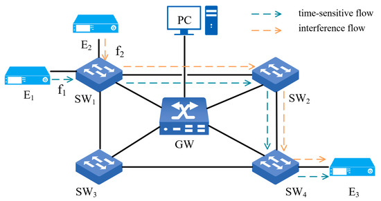 Flow 1 represents a time-sensitive data stream of highest priority, while stream flow 2 serves as an interfering stream with lower priority and a variable payload size to simulate the state of the network from idle to busy. In the experiments, the maximum allowable latency for flow 1 is set to 500 microseconds. The talker for flow 1 is deployed at endpoint E1, and the listener is positioned at endpoint E3. The routing path of flow 1 is established as E1–SW1–SW2–SW4–E3. The talker for flow 2 is deployed at endpoint E2, and the listener is positioned at endpoint E3 as well. To ensure that flow 2 interferes with the transmission of flow 1, the routing path is set to E2–SW1–SW2–SW4–E3.