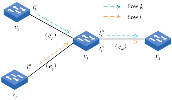 In practice, a data flow may consist of one or multiple frames. Instead of employing frame isolation constraints, which offer higher fault tolerance, this paper opts for flow isolation constraints to reduce the number of decision variables and thereby simplify the scheduling model. As shown in Figure 3, assume that two flows, flow and flow , are passing through a common edge . A constraint must be placed on the timing of their arrival at this edge. If flow arrives at first, flow must wait until flow completes its transmission on the common edge before it can proceed to the next edge from the previous hop edge . The same applies if flow arrives at first. Specifically, at any given time, a switch output port’s buffer queue of the switch’s egress port is restricted to storage frames exclusively from the same data flow. Only after the current flow has been completely transmitted from the port will the next flow be transmitted from its previous node to the current node.