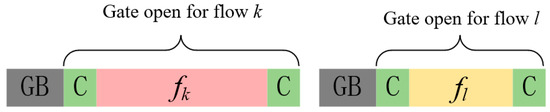 Here, represents the guard band, defined as the duration required to transmit a maximum-sized frame over the link. In addition to the guard band, we introduce a compensation value within this constraint to increase the separation between two flows. As illustrated in Figure 4, this allows us to add compensation at both ends of each flow’s required transmission slot, thereby mitigating the potential impact of external factors that may cause actual traffic to arrive earlier or later than expected. This enhancement improves the interference resilience of the TAS mechanism when applied in practical scenarios.