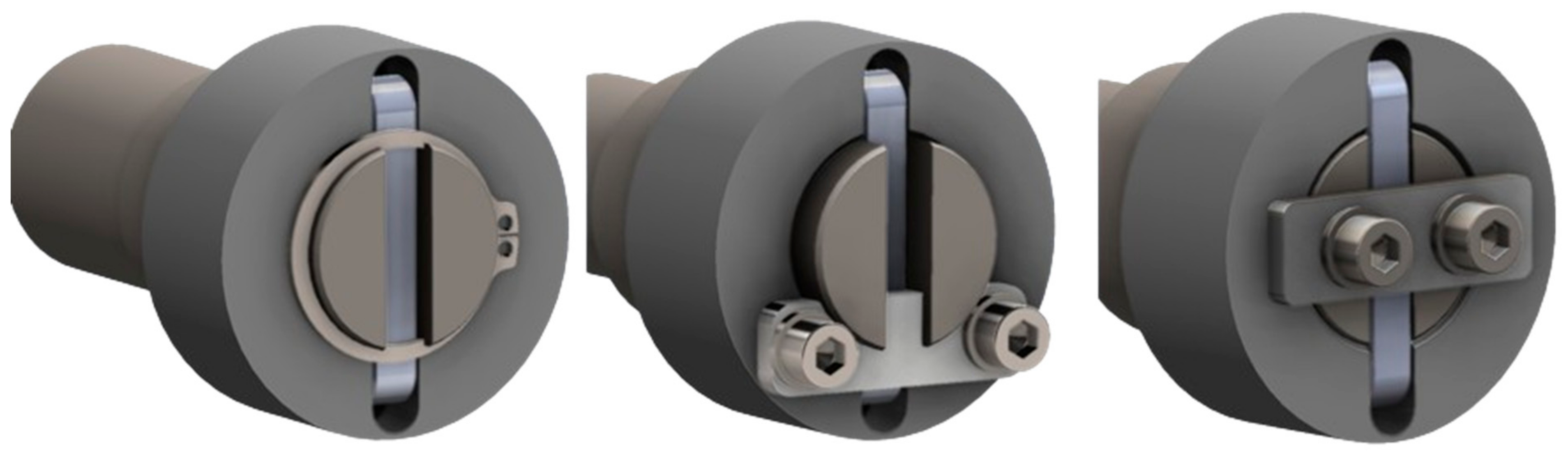 Figure 3, three possible approaches of securing the shaft key and hub are illustrated: using a retaining ring (a), using a locking plate (b), and using screws and a washer (c). The presented locking methods are illustrative, and an experienced designer can devise alternative solutions. It is crucial to consider potential weakening of the shaft and hub, particularly with methods (b) and (c).
