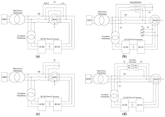 Schemes for DFIM start-up: (a) Opposite phase sequence; (b) Autotransformer and variable resistors; (c) Stator short-circuit; (d) Auxiliary converter.