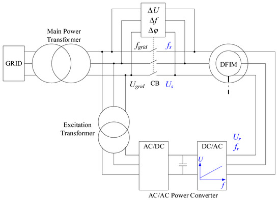 As shown in Figure 2, the stator of the DFIM is connected to the system through the main power transformer and the main CB, which is equipped with an automatic synchronizing relay. The rotor winding is supplied via two back-to-back converters (grid side and rotor side converters, interfaced by a DC link), powered through an excitation transformer. The shaft is mechanically coupled to the hydro turbine.