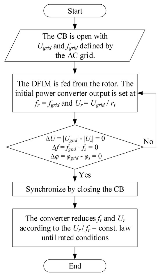 The algorithm that summarizes the start-up process is presented in Figure 3. At the initial conditions, the DFIM is at standstill conditions (zero mechanical speed, ωmec = 0), with the main CB in an open state, i.e., isolated from the grid. In this scenario, grid synchronization conditions must be met.