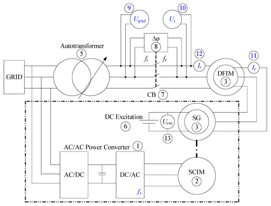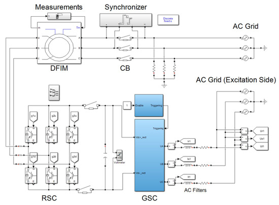 Typically, DFIM systems are directly grid-connected, featuring a reduced-power converter [16] connected to the rotor that operates at variable frequency. This configuration facilitates the straightforward adjustment of the DFIM’s operating point, to accommodate varying primary energy inputs.