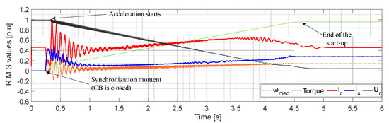 From Equation (1), it follows that for a start-up from ωmec = 0, the electrical frequency of the rotor (fr) imposed at the terminals of the power converter must be equal to the stator frequency (fs), which is also the grid frequency (fgrid). Furthermore, for a start-up from zero ωmec, which is a common scenario for motor start-ups, the imposed voltage at the power converter terminals must be the rotor rated voltage (Ur) for fr = fs. This ensures that the induced stator voltage (Us) matches the grid voltage (Ugrid) prior to synchronization (Ur = Ugrid/rt, with rt being the rotor/stator voltage ratio). The imposed voltage at the power converter terminals should be controlled under a constant flux strategy. It must be noticed that in the case of turbine start-up mode, i.e., the shaft can be already rotating, fr should be the difference between shaft frequency and fgrid to impose fs = fgrid and then perform the CB closure. The following explanations describe the motor start-up mode, as it is more critical than the turbine one due to the counter torque present in this mode of operation.