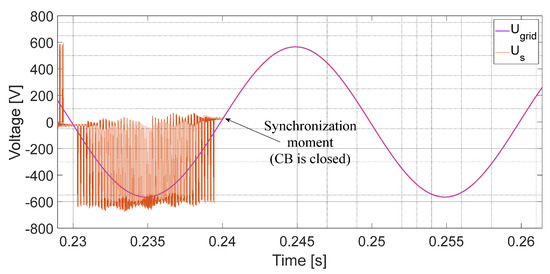 Finally, in Figure 6 the grid and stator voltages are shown. The voltage on both sides of the CB during the synchronization process is plotted. Before the CB was closed, the stator voltage pulsed due to the PWM converter feeding the rotor of the machine. After closing the CB, Ugrid was imposed.