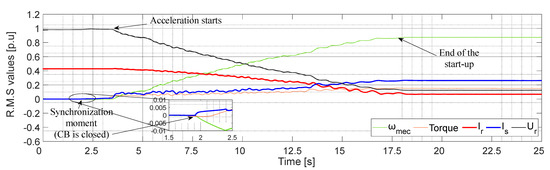 Provided that the phase sequence is identical on both sides of the CB, once the converter control has matched the voltage and frequency values with those of the grid (ΔU = |Ugrid|−|Us| = 0 and Δf = fgrid−fs = 0), the breaker (CB) is closed when the phase shift is null (Δφ = 0). The machine is thus synchronized to the grid at standstill conditions. Since the rotor’s frequency is the same as the stator’s, their fluxes are synchronized, preventing the generation of a torque. Consequently, the shaft remains at ωmec = 0 after synchronization.