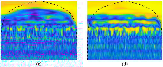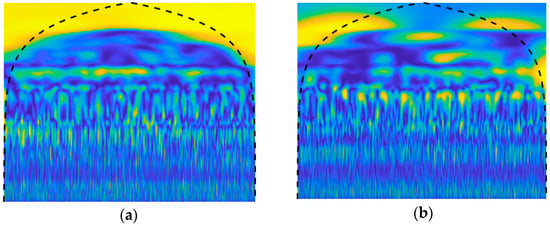 In Equation (2), represents the cross-wavelet transform. This coherence function provides a visual representation of how closely the signals align over time and across frequency bands, with brighter colors in the wavelet coherence spectrum indicating higher coherence values. The wavelet coherence spectrum serves as an insightful diagnostic tool. Yellow regions signify high coherence, typically seen in normal operation or specific stable fault states. Blue regions indicate low coherence, often associated with faults that introduce significant deviations, such as MSHs. Green regions suggest transitional dynamics, representing gradual or minor disturbances. Each coherence spectrum includes a Cone of Influence, demarcated by a dashed line, which identifies areas where boundary effects might reduce accuracy. By focusing on coherence variations, WCA offers a robust framework for detecting transient and frequency-specific patterns associated with faults, providing essential insights for centrifugal pump maintenance and fault diagnosis.