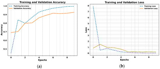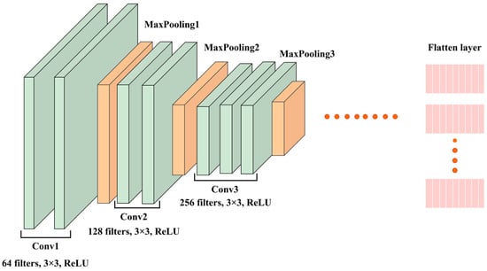 VGG16 is a 16-layer deep CNN architecture known for its simplicity and depth, which consists of 13 convolutional layers and 3 fully connected layers. Each convolutional layer uses small 3 × 3 filters, followed by max-pooling layers to down-sample the spatial dimensions, which helps the model capture hierarchical feature patterns []. The architecture is designed to progressively learn fine-grained features from low-level edges to high-level object representations through successive convolutional layers. The feature extraction process in VGG16 can be represented as follows: