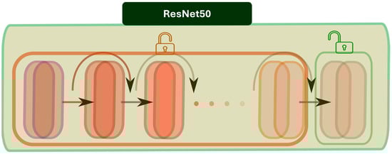 In Equation (4), is the input to the block, is the residual function representing the convolutional layers within the block, and is the output after adding the input back to the residual function. This formulation helps the network learn identity mappings, facilitating the extraction of both fine and coarse features essential for distinguishing between different fault conditions. Figure 4 shows the ResNet50 architecture with residual blocks as below: