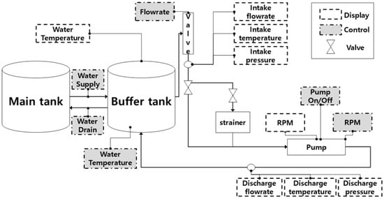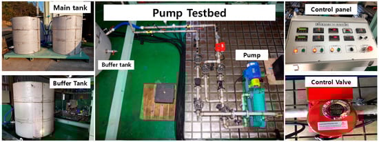 In this study, we used a CP, specifically the PMT-4008 model (Hanil, Gwangju, Republic of Korea), mostly used in industrial applications, powered with a 5.5 kW motor. The system was managed via a panel equipped with essential components: a switch, temperature and water supply regulators, speed and flow rate controllers, pressure gauges, and display screens. The fluid transport system consists of steel pipes connected to two tanks: a main tank and a buffer tank. The main tank was set at an elevation to provide the net positive suction head (NPSH) required at the pump’s inlet, ensuring continuous operation of the CP. The experimental setup, illustrated in Figure 6 and Figure 7, operated within a closed-loop design. Upon initializing the setup, water began circulating throughout this loop. To collect vibration data from the CP, four accelerometers were strategically placed: two directly on the pump casing and two at the mechanical seal and impeller locations. Each sensor’s output was routed to a recording system, where the signals were subsequently digitized using a National Instruments 9234 device at a signal monitoring station. Table 3 provides the details about the data acquisition system.