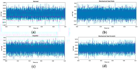 CPs are vulnerable to both hydraulic and mechanical faults, with mechanical issues being more frequently encountered in practice []. Maintaining the reliable operation of CPs is strongly dependent on the early detection of these mechanical faults, particularly those involving impeller damage and mechanical seal failures [,,,,]. These mechanical faults have a significant impact on the vibration signals produced by CPs, often causing abrupt, irregular vibration patterns that require careful analysis for accurate fault diagnosis. Signal processing plays a critical role in this diagnostic process, involving initial data preprocessing and the extraction of relevant features [,]. This process uses various techniques across the temporal, frequency, and time–frequency domain (TFD) analyses, enabling comprehensive insights into the underlying fault characteristics [,,].