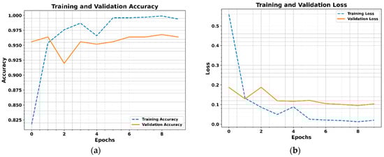 Proposed method training and validation (a) accuracy and (b) loss, against the number of epochs.