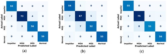 This method represents a robust solution by combining the strengths of VGG16 and ResNet50 architectures. The fusion of complementary features, followed by fine-tuning with a dataset specific to centrifugal pumps, yields a significant improvement in classification accuracy. This integrated approach highlights the effectiveness of hybrid feature fusion, making it a powerful tool for advancing condition monitoring and fault detection in centrifugal pumps. The proposed model is validated using experimental data from the centrifugal testbed. The results demonstrate the robustness and generalization ability of the model, achieving accurate fault detection across various fault conditions. Visualizations, including confusion matrices and accuracy curves, showcase the model’s effectiveness in fault classification. In Figure 1, N, MSH, MSS, and IF represent the normal, mechanical seal hole, mechanical seal scratch, and impeller fault, respectively.