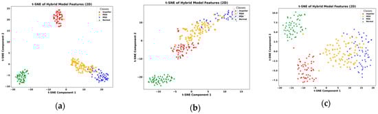 Comparison of t-SNE plots of (a) proposed method with (b) Wen et al. [] and (c) Kumaresan et al. [].