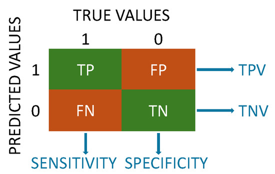 The most common error metrics in the context of ML algorithms for classification, as they are in our case, are based on a confusion matrix based on the values of the original response variable and the values predicted by the algorithm. The matrix has four entries that we call true positive (TP), true negative (TN), false positive (FP), and false negative (FN), respectively; see Figure 2. In our context we call a “positive” when the system is working, i.e., , and a “negative” means that the system is in failure, .