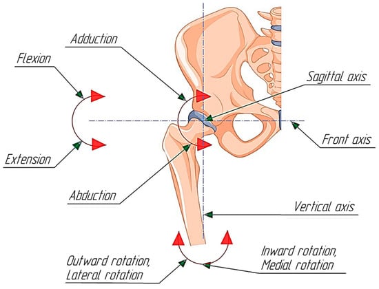 The hip joint can be modeled as a ball-shaped joint of a limited type (cup-shaped joint), and therefore allows movement, although not as extensive as in a free ball joint (for example, in the shoulder), around three main axes: frontal, sagittal and vertical. Lateral and medial rotation occurs relative to the vertical axis, extension and flexion occurs relative to the frontal axis, and abduction and adduction occurs relative to the sagittal axis, as indicated in Figure 1.