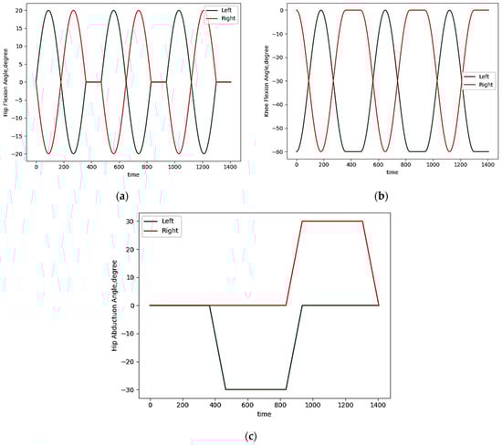 Figure 2 shows the planned sequence of movements as a reference for joint trajectories. Figure 2a shows the sequence for flexion of the hip joint, Figure 2b shows the knee, and Figure 2c shows abduction of the hip joint.
