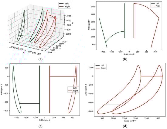Reference movement of the center of the ankle joint: (a) three-dimensional view; (b) in projection on the XY plane; (c) in projection on the XZ plane; (d) in projection on the YZ plane.