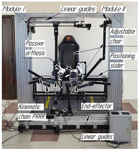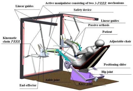 - A novel hybrid modular structure of a robotic system for the rehabilitation of the lower limbs is designed as based on two modules identical in structure, including an active 3-PRRR manipulator for moving the patient’s foot and a passive orthosis based on the RRR mechanism for supporting the lower limbs;