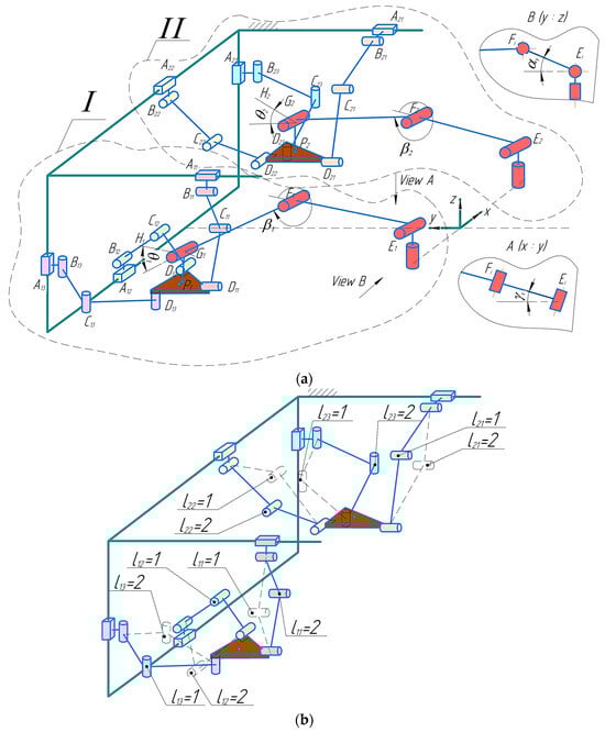 Kinematic scheme of rehabilitation system: (a) the kinematic design (I is the left module for the left limb; II is the right module for the right limb), (b) an alternative design for the kinematic design.