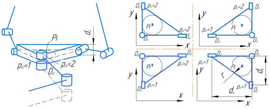 Let us denote the variants of configurations of kinematic chains as ; they take values 1 and 2 in accordance with Figure 5a. Considering that the center of the joint is located at the intersection of a circle with center and radius and a circle with center and radius , the coordinates can be determined as follows: