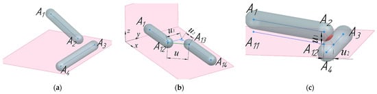 In case 2, the links are not parallel. Let’s construct an auxiliary plane in which the segment will lie, with the segment parallel to this plane. In this case, the distance between the segments is determined by Formula (36), where is the distance between the segment.
