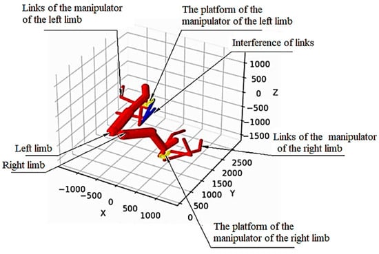 The values of and are determined similarly. If condition (35) is not met, the following check is carried out for the absence of intersections, when the minimum distance between the segments and is greater than the sum of the radii of the links .