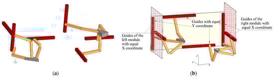 The design in Figure 4 is better explained by the model in Figure 5. Figure 5a shows the kinematic design with labels for all of the joints of the active manipulators, as well as the joints and angles of the passive orthoses. In Figure 5a, where I is for the left module for the rehabilitation of the left limb, and II is for the rehabilitation of the right limb. The 3-PRRR mechanism, which provides movement of the patient’s limb through active actuators, consists of three kinematic chains, a fixed base, and a moving platform. The 3-PRRR mechanism (Tripteron) provides the necessary degrees of freedom (translational movements along three axes) and the absence of singularity, since the Jacobian matrix of the mechanism is a unit matrix. Each chain contains one drive prismatic joint (P) and three rotation joints (R). Linear actuators are connected to active linear translational pairs, which in turn are connected to guides and passive RRR chains connected to the moving platform. The configurations of kinematic chains, (hereinafter in the formulas i is the module index: 1—left module, 2—right module, j—index of kinematic chains of active manipulators), are variable, which means the possibility of bending chains in different directions is present. Each of the chains have two possible configurations that are designated as in Figure 5b. Also, the presented structure, in comparison with a single-module structure, assumes the use of the platform shape , not in the form of a regular triangle, but in the form of a right triangle with variability in the options for attaching kinematic chains to the platform (Figure 6). This assumes that the joints can be located on different sides, relative to the center of the platform (—can be located in both the negative and positive directions along the Y–axis, —along the X–axis, —along the Z–axis). The active manipulator is connected to the passive orthosis through the link GP, connecting the G joint from the ankle joint of the passive orthosis and the center P from the movable platform of the active manipulator. Each of the passive sections includes four rotational joints, two of which correspond to the hip joint ( with angles flexion/extension and abduction/adduction of the joint), one knee ( with angle flexion/extension of the joint) and one ankle ( with the angle of joint flexion/extension). The point corresponding to the toe of the human foot is designated as . The relative position of the active manipulator and the passive orthosis, as well as the relative position of the two active manipulators, are determined by the value of two constant coordinates of each of the active manipulator’s guides, relative to the base coordinate system located in the center of the patient’s pelvis. Figure 5a shows the effect of changing the coordinates of the guides on the system configuration, using the example of the second guide of the left module (), which has a lower Z coordinate value compared to the first guide () of the left leg module and the first and second guides of the right leg module ( and ).