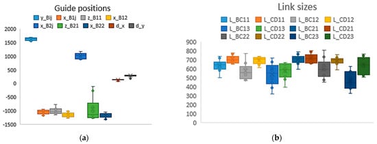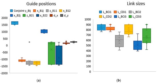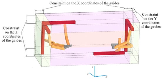 The optimization problem consists in the selection of parameters to ensure the compactness of the mechanism when performing the trajectory of rehabilitation of the lower limbs. Various methods can be used for optimization including multi-objective robust design optimization method for a mechatronic system [28] and mechanical structure optimization followed by FEM analysis to verify the changes made [29]. By optimization of the task placement, a reduction in energy costs in parallel manipulators is achieved [30], and nonlinear optimization problems can be solved using the reconfiguration of a parallel manipulator [31]. The problem under consideration is non-trivial. Let us formulate the optimization problem with the following steps: