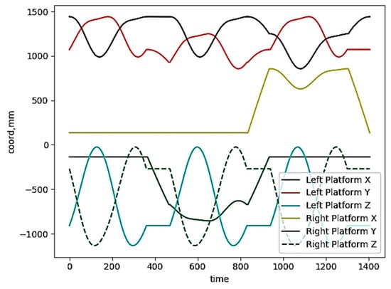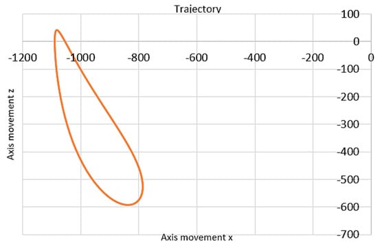 Considering the dimensions of the orthosis, which includes the frame and structural elements used to protect the limb, the dimensions have been adjusted. Based on the thickness of the human leg orthosis, equal to 15 mm, the thigh width is taken to be 30 mm larger (15 mm∙2), and the thigh circumference is 95 mm larger (15 mm = 94.25 mm). Considering the increased thickness of the calf orthosis, equal to 30 mm, taking into account the possibility of adding additional safety elements, the circumference of the calf muscle is increased by 188 mm, the length of the foot by 30 mm, and the width of the foot by 60 mm. Also, taking into account the possibility of adding safety-structural elements, the length of the lower leg has been increased by 200 mm. Taking into account the dimensions of the reference data, the trajectory of the reference movement is designed as in Figure 2, as the assumed trajectory of assisted joints by the rehabilitation system. Figure 3 shows the change in the position of the center of the ankle joint, taking into account the planned sequence of movements and the selected dimensions of the orthosis.