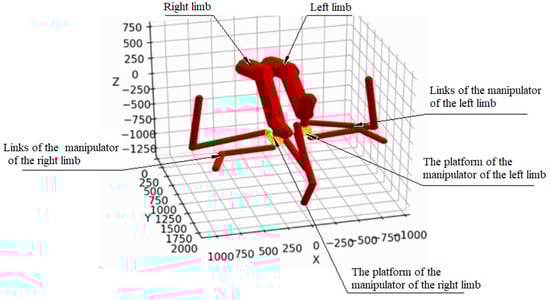 The proposed hybrid robotic system consists of two modules identical in structure, each of which is based on an active 3-PRRR mechanism of a parallel structure, which ensures the movement of the patient’s fixed foot, and a planar RRRR mechanism of a serial structure as a passive cut to support the lower limb, as sketched in Figure 4. The modular structure allows for a change to the parameters of the systems depending on the method of rehabilitation and, depending on the anthropometry and characteristics of the disease, the use of one and two modules simultaneously. The mutual movement of the end-effector of the two manipulators makes it possible to simulate the gait of a healthy person, while safe movement algorithms are implemented taking into account possible intersections (collisions) of the links.