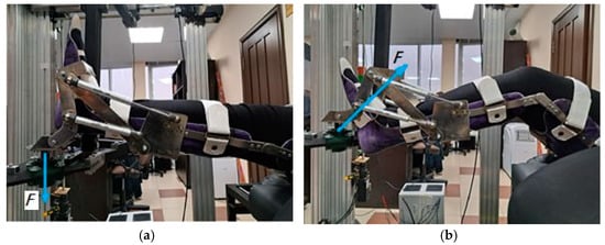 Similarly, when the orthosis is exposed to a force exceeding the rigidity of the elastic elements, directed along the X–axis, the lower pair of elastic elements is compressed, and the orthosis is displaced in the opposite direction (Figure 20).