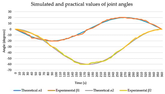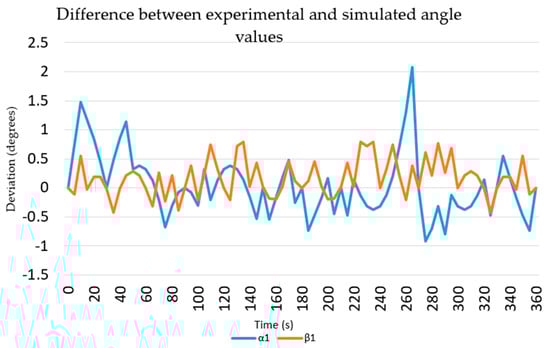 A comparison was made of the simulated and experimentally obtained values of the angles in the hip and knee joints when moving along the rehabilitation trajectory. The discrepancy was measured to assess how accurately the experimental sample allows for a change in angles in the patient’s joints (Figure 22).