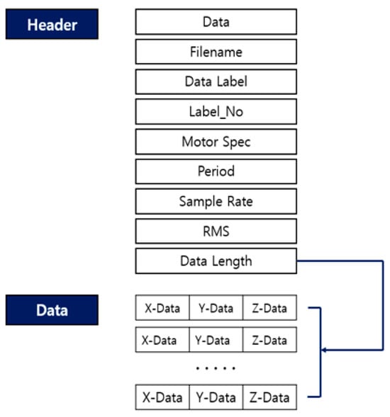 The data structure depicted in Figure 1 consists of header and data sections. The header section is organized based on the characteristics of the mechanical device and data attributes. The data section includes actual collected data values such as time and acceleration. This data structure was designed to allow users to extract desired parameters using raw data.