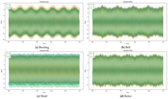 Example of raw data from ‘R’, ‘S’, and ‘T’ phases for Bearing, Belt, Shaft, and Rotor.