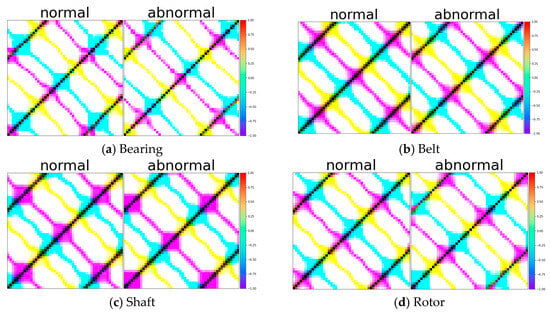 The Gramian angular field (GAF) is an algorithm that visually represents the temporal correlations in time series data using polar coordinates []. The matrix based on these polar coordinates has the advantage of more effectively preserving correlations when transforming time series data into images. The GAF is classified into two methods based on the sum and difference of angles. The Gramian angular summation field (GASF) is defined by the sum of angles in polar coordinate time series data, as shown in Equations (2) and (3). The horizontal axis (X-axis) represents the passage of time or a sequence of time series data, and the vertical axis (Y-axis) represents the sum of the cosine values at each grid point after converting the data for that time step into degrees. This effectively represents the patterns and structure of time series data as an image. The results of the transformation of time series data using the are depicted in Figure 4.