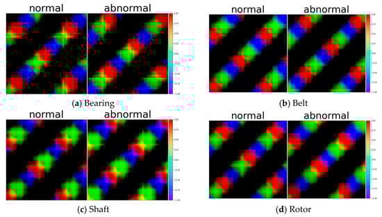 The belt dataset used in the experiment comprised 130,000 normal and 372,000 abnormal data, and the bearing dataset comprised 154,000 normal and 400,000 abnormal data. The shaft dataset encompassed 194,000 normal and 728,000 abnormal data, and the rotor dataset consisted of 1,334,000 normal and 458,000 abnormal data. For each dataset in the model, the ratio of train, test, and validate was 70:24:6. Experiments were conducted for each of the bearing, belt, shaft, and rotor datasets with 15 different configurations. These configurations included variations in input combinations (RP, GASF, and GADF) and model architectures (single-input CNN, concatenated multi-input CNN, and addition multi-input CNN). We also explored image fusion using single-input CNN.