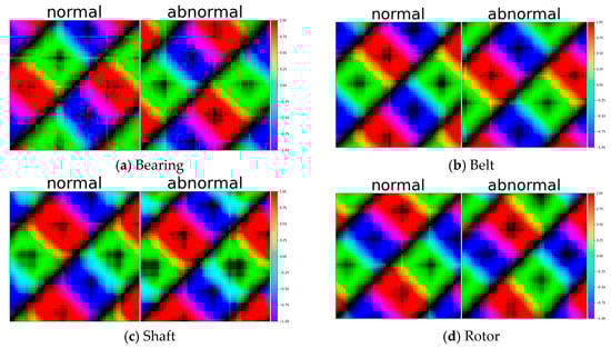 Samples of test data with GASF (Gramian angular summation field) for Bearing, Belt, Shaft, and Rotor.