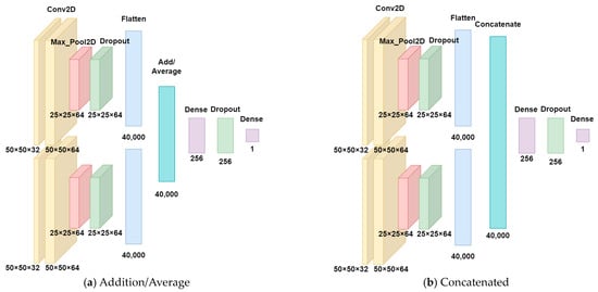 Multi-input CNN model structure, where (a) two inputs are combined with an additive/average function, and (b) two inputs are combined with a concatenation function.