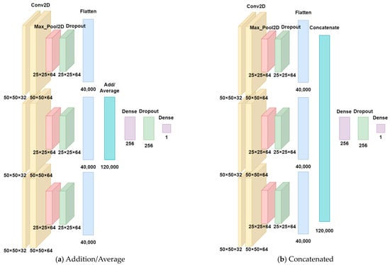 Triple-input CNN model architecture, where (a) three inputs are combined with an additive/average function, and (b) three inputs are combined with a concatenation function.