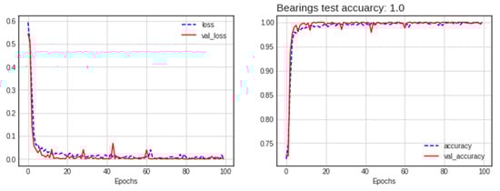 Loss and accuracy of the best model (concatenated RP-GADF) for the bearing dataset.