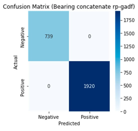 Through the comparison of the results in Table 3, it can be observed that the concatenate multi-input (GASF-GADF) and average multi-input (RP-GADF) had superior performance compared to other configurations. These models achieved 100% accuracy by correctly classifying all faults, and they also exhibited the highest precision, recall, and F1 scores. This indicates that models utilizing concatenation with multiple inputs achieved the most effective fault classification, particularly in the case of bearings. Figure 9 shows the loss and accuracy of the RP-GADF model in epochs, and Figure 10 shows the confusion matrix results.