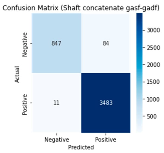As shown in the comparison results in Table 5, the concatenated multi-input (GASF-GADF) model demonstrated superior performance compared to other configurations. This model exhibited the best performance in terms of accuracy, precision, and F1 score. In all evaluation metrics except recall, the model yielded excellent results in effectively predicting shaft faults. Figure 13 shows the loss and accuracy results in epochs for the best model, and Figure 14 shows the confusion matrix.