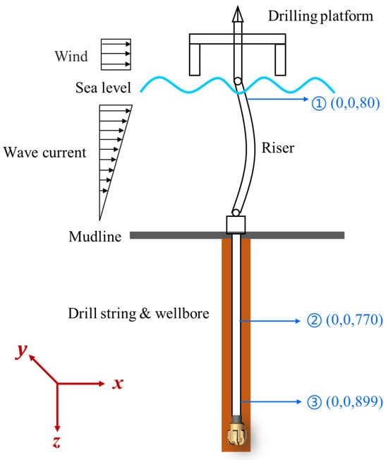 In order to investigate the impact of riser movement on drillstring motion characteristics and vibration generation in deep-water drilling systems under ocean environmental loads, we have integrated the riser model with the drillstring dynamic model, resulting in the establishment of a comprehensive dynamic model for deep-water drilling systems as depicted in Figure 1. This model takes into account the dynamic periodic action of the riser, impacts between the drillstring system and both the riser and wellbore, as well as interactions between the drill bit and rock formations. It primarily focuses on analyzing different parameters such as WOB and rotational speed to understand their influence on drillstring dynamic response. The fundamental assumptions underlying this deep-water drilling system dynamics model are outlined below.